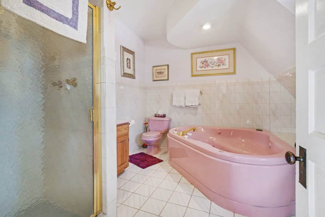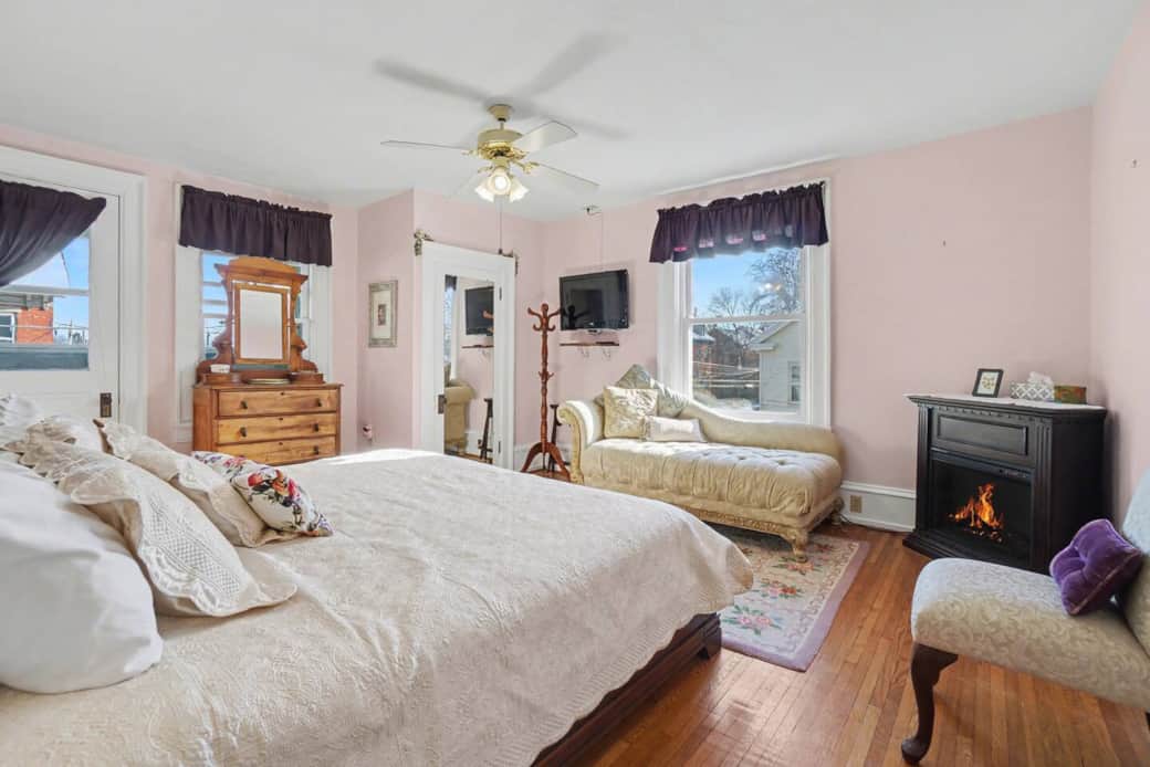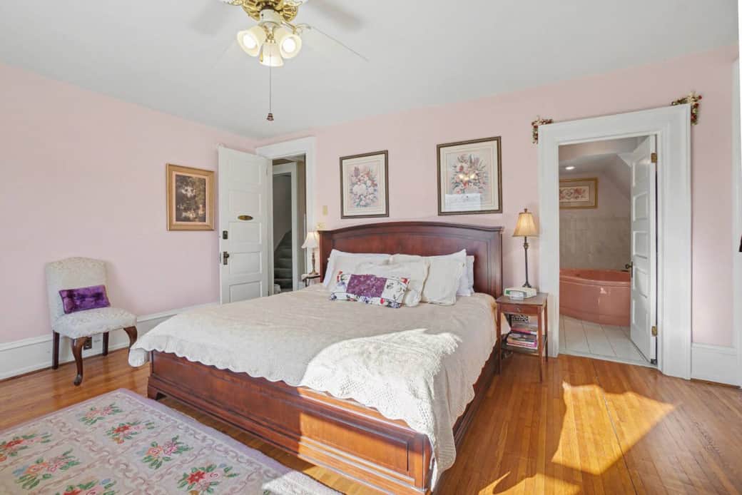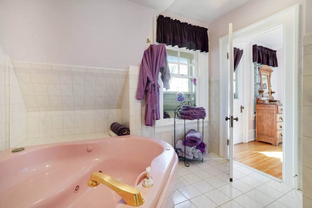 Our Lavender N Lace room is our largest room featuring a vintage chaise lounge and king size bed. An additional single size cot is available in the room to accommodate an extra guest. The large bathroom features a whirlpool jet tub for relaxing and soaking.